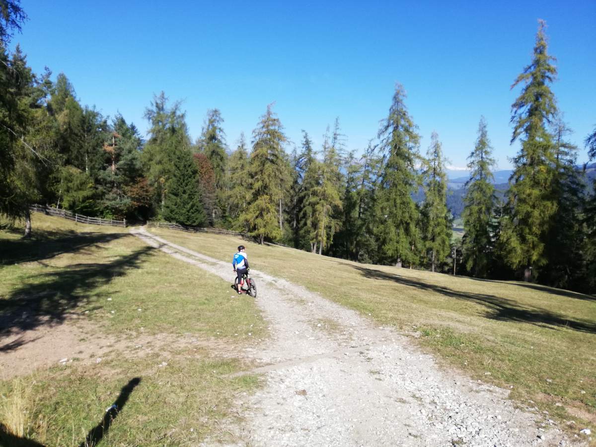 Una volta raggiunta la Cappella di San Cipriano in centro, ci imbocchiamo nella via Oberstrasse, e la seguiamo rimanendo sempre a destra fino al termine della via presso un abitazione privata imbocchiamo il viale nel bosco e manteniamo ad ogni bivio la destra fino a raggiungere la frazione di Umes li si passa attraverso il paese verso la chiesa di San Martino di Umes e poi via lungo il tracciato fino a Mulino Maso Moar e da li si sale a destra lungo il tracciato fino a raggiungere la meravigliosa Malga Tuff, Fiè allo Sciliar (consigliata la sosta se non troppo affollato). Siamo scesi lungo il sentiero che porta direttamente al Lago di Fiè dove ci siamo fermati per 1.5ora per un buon piatto di canederli (ed abbiamo caricato la batteria). Dopo la pausa abbiamo preso un bellissimo track fino alla cabinovia Alpe di Siusi (Seis -Seiserlam)